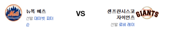 웹이 무너졌다. 로비 레이에게 부담이 많이 들수 있을듯. 레이는 홈 강점이 있고 피터슨은 원정 약점이 있는데 문제는 샌프란시스코가 좌완에게 상당히 약한 팀이라는 점이다. 이번 경기는 후반 불펜전의 가능성이 높은데 최근 메츠 최대의 약점은 접전 상황에서의 불펜이고 이 점이 결국 승부를 가를 것이다. 후반에 강한 샌프란시스코 자이언츠가 신승을 가져갈 것이다.