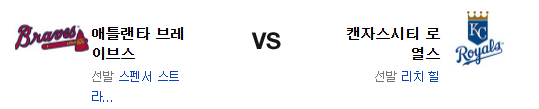 애틀랜타는 좌완에게 약하고 캔자스시티는 강속구 공략이 쉽지 않은 팀이다. 이번 경기는 은근히 막상막하의 경기가 될 가능성이 높은 편. 게다가 양 팀 모두 불펜에 문제가 심각하다는 공통점이 있는데 캔자스시티는 홈 한정으로 막판 타격이 좋은 편이고 이 점이 결국 승부를 가를 것이다. 후반에 강한 캔자스시티 로얄스가 신승을 가져갈 것이다.