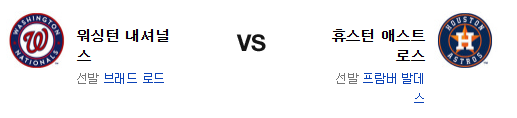 홈에서 애슬레틱스 상대 시리즈 스윕 패배. 휴스턴은 그야말로 비상이 걸렸다. 그래도 로드 상대로는 어느 정도 승부가 될수 있을듯. 물론 워싱턴이 최근 2경기에서 놀라운 타격을 보여준건 사실이지만 이 팀의 타선은 좌완에겐 약한 편이고 발데즈는 홈 경기 강점이 확실한 투수다. 선발에서 앞선 휴스턴 애스트로스가 승리를 가져갈 것이다.