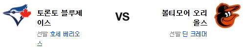 토론토 블루제이스는 호세 베리오스(7승 4패 3.83)가 시즌 8승에 도전한다. 26일 디트로이트 원정에서 6이닝 2실점의 호투로 승리를 거둔 베리오스는 앞선 2경기의 부진을 극복해냈다는 점이 긍정적인 부분이다. 최근 홈에 비해 원정 경기 투구가 좋은 편인데 4월 14일 볼티모어 원정에서 5이닝 4실점으로 부진했고 금년 낮 경기 방어율 6.07과 피안타율 .302가 변수가 되기에 충분해 보인다. 전날 더블헤더에서 각각 2점과 3점에 그친 토론토의 타선은 볼티모어의 투수진 공략에 애를 먹고 있는 중이다. 특히 2차전에서 브랜든 영에게 2점에 그쳤다는건 심각하게 봐야할 요소다. 2경기 연속 흔들린 불펜 역시 마무리 문제가 대두되는중.