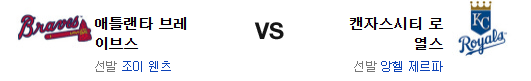 애틀랜타 브레이브스는 조이 웬츠(2승 2패 5.76)가 시즌 3승 도전에 나선다. 26일 텍사스 원정에서 4.1이닝 4실점의 부진으로 패배를 당한 웬츠는 어중간한 좌완 투수의 한계를 여실히 드러낸바 있다. 일단 이번 시즌 AL팀 상대로 유독 부진하기 때문에 이번 경기 역시 기대를 가지기엔 무리가 있어 보인다. 전날 경기에서 비록 패배하긴 했지만 캔자스시티의 투수진을 상대로 홈런 2발 포함 6점을 득점한 애틀랜타의 타선은 이번 시리즈에서 주목할만한 모습이 역력하다. 투수진이 팽팽하다면 충분히 승부가 가능한 레벨. 그러나 3.1이닝동안 5실점을 허용한 불펜은 그저 한숨이 나올 뿐이다.