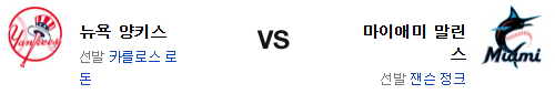 양키스의 타격은 홈과 원정의 차이가 있는 편이다. 게다가 전날 경기에서도 드러났듯이 홈런 의존도가 상당한 편. 물론 이전에 비해 불펜의 차이가 엄청나긴 한데 로돈이 과연 버텨주느냐가 관건일듯. 하지만 마이애미는 헤수스 산체스의 트레이드로 좌완 상대 공격력이 많이 약해졌고 양키스는 후반이 강해졌다. 불펜을 보강한 양키스가 신승을 가져갈 것이다.