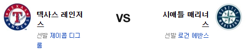 텍사스 레인저스는 레인저스는 제이콥 디그롬(10승 3패 2.55)이 시즌 11승에 도전한다. 29일 에인절스 원정에서 5.1이닝 5실점의 부진으로 패배를 당한 디그롬은 최근 불거진 원정 문제가 기어코 사단을 일으키고 말았다. 금년 시애틀 상대로도 홈에서 강하고 원정에서 부진했기 때문에 이번 경기 역시 불안한건 매한가지다. 전날 경기에서 시애틀의 투수진을 공략하면서 카일 히가시오카의 2점 홈런 포함 6점을 올린 텍사스의 타선은 1차전의 부진을 이겨냈다는 점이 고무적이다. 2차전부터 확실하 타격은 제 모습을 보여주는 중. 그러나 또다시 2점 홈런을 허용한 로베르트 가르시아는 마무리에서 강판시켜야 할것 같다.