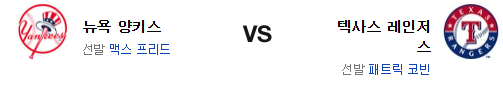 양키스의 경기력이 수상하다. 마이애미 원정에서 스윕 패배를 당한건 상당한 충격이 있을듯. 게다가 마이애미에서 텍사스로 넘어온다는것도 문제다. 물론 프리드는 호투를 기대할수 있고 코빈 역시 홈에서의 투구가 좋은데 타격이 살아나느냐가 관건이다. 홈의 잇점을 가진 텍사스 레인저스가 신승을 가져갈 것이다.
