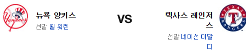 전날 경기는 양키스의 현재 상황을 대변해주는 경기라고 해도 과언이 아닐 정도. 홈런 의존도가 높고 불펜 역시 좋지 않은 편이다. 거기에 이볼디는 홈 경기의 투구는 그야말로 최고 레벨. 반면 워렌은 원정 투구가 좋지 않은 편이고 이 점은 승부를 바꾸기에 부족함이 없다. 선발에서 앞선 텍사스 레인저스가 승리를 가져갈 것이다.