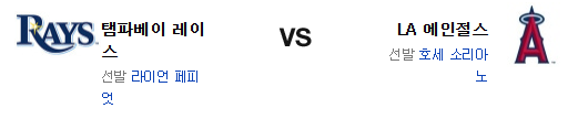 탬파베이의 타격이 부진하다. 특히 홈 경기의 부진이 원정까지 이어졌다는 점은 매우 치명적이다. 소리아노가 홈에서 최근 투구가 좋다는것도 변수. 물론 페피옷이 원정에서도 흔들리지 않는 투수이긴 하지만 그들의 불펜이 버텨줄지는 부정적이다. 홈의 잇점을 가진 LA 에인절스가 승리를 가져갈 것이다.