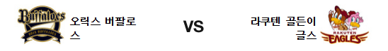 라쿠텐 골든 이글스는 쇼지 코세이(1승 2.11)가 시즌 2승 도전에 나선다. 복귀전이었던 31일 치바 롯데와 도쿄돔 경기에서 5.2이닝 3안타 1실점의 호투를 보여준 쇼지는 좋을때의 모습을 그대로 유지하고 있는 중이다. 작년 부진한 와중에도 오릭스에겐 강했기 때문에 이번 경기도 5~6이닝은 잘 기대해볼수 있을 것이다. 전날 경기에서 비록 승리하긴 했지만 7회말 터진 호리우치 켄고의 2점 홈런이 유일한 득점이었던 라쿠텐의 타선은 홈 경기의 타격이 여전히 좋지 않은 편이다. 그래도 예상치 못한 타자들이 제 몫을 해준다는건 팀의 사기를 올려주는 포인트. 2.2이닝을 무실점으로 막은 불펜은 이번 경기에서 스즈키 소라 1명 믿고 가야 한다.