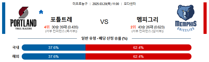 멤피스가 승리를 가져갈 것이다. 또한, 3점슛 시도가 많은 경기가 예상되는 만큼 오버 경기다.