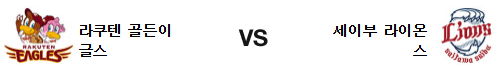 라쿠텐 골든 이글스는 타키나카 료타(4승 7패 3.09)가 시즌 5승에 도전한다. 1일 소프트뱅크 원정에서 5.1이닝 3실점의 부진으로 패배를 당한 타키나카는 소프트뱅크 상대 강점을 상실한게 문제가 될수 있는 부분이다. 세이부 상대로 이번 시즌 원정에서 5이닝 5실점으로 부진하는등 영 상성이 좋지 않다는 점이 불안 요소다. 목요일 경기에서 미야기의 투구에 막혀 있다가 오릭스의 불펜을 완파하면서 7점을 올린 라쿠텐의 타선은 홈 경기 막판에 타선의 집중력이 확 올라왔다는 점이 고무적이다. 이 팀의 타선은 원정에서 더 좋다는 점을 주목해야 한다. 3이닝을 무실점으로 버틴 불펜은 8회초 놀라운 홈 송구를 보여준 나카지마 다이스케에게 감사해야 한다.
