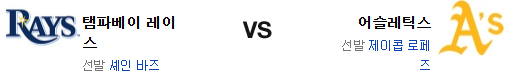스프링스가 무너졌다. 이는 로페즈 역시 불안함을 안길수 있는 부분. 그러나 페피옷 역시 QS를 하지 못했기 때문에 바즈에 대한 기대치 역시 낮다. 이번 경기는 상당한 타격전 가능성이 높은데 탬파베이는 전날 승리조를 써버린게 이번 경기에서 악영향을 미칠수 있다. 힘에서 앞선 애슬레틱스가 승리를 가져갈 것이다.