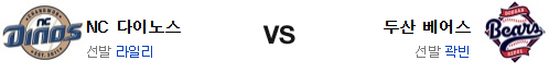 최근 두산의 타선은 강속구 상대가 영 좋지 않은 편이다. 라일리 공략은 쉽지 않을듯. 곽빈 역시 일단 홈에서의 투구는 기대를 해볼만 한 편. 그러나 최근 두산의 불펜은 클러치 상황에서의 투구가 여러모로 좋지 않고 NC는 어떻게든 물량 공세로 헤쳐나가고 있다. 후반에 강한 NC가 신승을 가져갈 것이다.