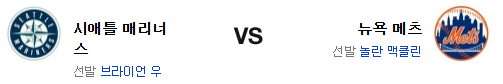 최근 메츠는 헬슬리가 4경기 연속 날려버리면서 시즌이 완전히 꼬여버렸다. 이번 경기도 그 후유증을 극복해야 할듯. 맥클레인의 투구는 기대의 여지가 많이 있지만 시애틀의 타선도 이제 불이 붙은 상황. 우의 투구는 원정에서 아쉬운 점을 고려하면 불펜이 중요한데 그 점에선 확실하게 시애틀이 우위에 있다. 후반에 강한 시애틀 매리너스가 승리를 가져갈 것이다.