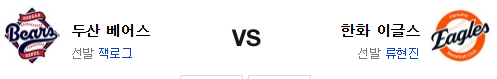 최근 한화 최대의 문제는 누가 뭐라고 해도 불펜이다. 즉, 선발에서 잘 버텨줘도 불펜에서 박살이 나버리는 케이스가 계속 나오고 있는 중. 거기에 덧붙여 최근의 두산은 7회 이후가 대단히 무서운 미라클 두산 모드에 들어가 있는 중이다. 류현진과 로그는 상대 전적과 최근의 투구를 고려한다면 막상 막하의 투수전을 예감케 하는 투수들. 그러나 불펜은 이야기가 확연히 다를 것이다. 후반에 강한 두산이 신승을 가져갈 것이다.