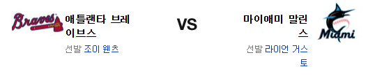 애틀랜타 브레이브스는 조이 웬츠(4승 4패 5.25)가 시즌 5승에 도전한다. 23일 메츠와 홈 경기에서 3.1이닝 6실점의 부진으로 패배를 당한 웬츠는 좋은 흐름이 단숨에 끊겨버렸다. 오히려 홈에 비해 원정 투구가 조금 더 좋은 투수라는 점은 이번 경기에서 나름 반등을 기대케 하는 포인트다. 전날 경기에서 알칸타라 상대로 단 2점에 그쳤다가 마이애미의 불펜을 박살내면서 무려 11점을 올린 애틀랜타의 타선은 9회에 9점을 올린게 대단히 컸다. 혼자서 2홈런 4타점을 올린 아지 알비스는 오래간만에 이름값을 해낸듯. 3.2이닝동안 1실점을 허용한 불펜은 조금씩은 나아지고 있다.