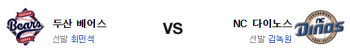 NC의 타격은 위력적이다. 문제는 두산의 타선이 살아날수 있느냐일듯. 일단 홈 경기의 김녹원과 최근의 최민석이라는 매치업은 김녹원의 우위일수도 있지만 타격전이 터질수 있는 매치업이기도 하다. 이번 경기에서 NC는 승리조를 전혀 쓸수 없다는 커다란 핸디캡이 있지만 최근 타격이 좋아도 너무 좋은 편이고 두산의 타격이 원정에서 살아나길 기대하기도 어렵다. 힘에서 앞선 NC가 승리를 가져갈 것이다.