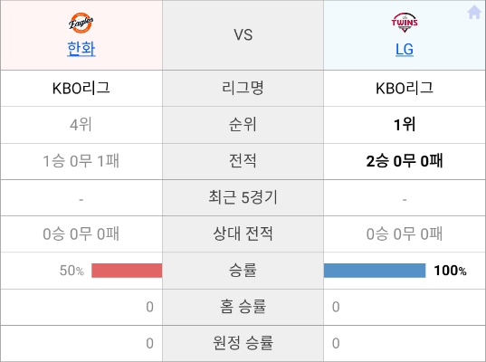 양 팀 모두 시즌 초반 좋은 경기력을 유지 중. 선발과 불펜 모두 큰 차이는 없지만, LG의 타격 우위가 뚜렷함. 다만, 류현진의 컨디션과 한화 불펜의 힘을 고려할 때 접전이 예상됨.
