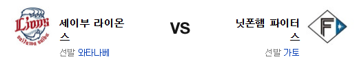 갈길 바빠 죽겠는데 닛폰햄이 세이부에게 일격을 당했다. 특히 전날 타카하시 상대로 고전했다는건 절대로 좋은 소식이 아닐듯. 전날 경기를 고려한다면 와타나베 공략은 쉽지 않을듯. 관건은 역시 카토가 어떤 투구를 하느냐인데 홈 낮 경기의 카토는 기복이 상당히 심한 편이다. 상성에서 앞선 세이부 라이온즈가 신승을 가져갈 것이다.