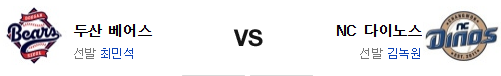 NC는 원정에서 경기도 하지 못하고 그대로 내려왔다. 이는 득이 될수도 있고 독이 될수도 있는 포인트. 하지만 두산 역시 전날 끝내기 패배의 여파가 상당한 상황이다. 김녹원과 최민석의 투구를 고려한다면 상당한 접전 가능성이 높은데 NC는 불펜이 한번 쉬었고 두산은 소모가 많다. 이 차이는 크다. 후반에서 앞선 NC가 신승을 가져갈 것이다.