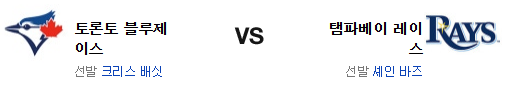 전날 경기는 토론토의 좌완 상대 약점이 터져버린 경기였다. 그러나 우완인 바즈 상대로는 승부가 될듯. 이번 시리즈에서 토론토의 타선은 탬파베이의 우완 강속구 투수들 상대로는 강점을 보여주고 있다. 반면 탬파베이의 타선은 여전히 부진하고 전날 가즈먼 상대로 단 1점으로 막힌건 시사하는 바가 크다. 상성에서 앞선 토론토 블루제이스가 승리를 가져갈 것이다.
