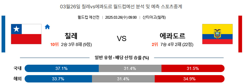 치열한 접전이 예상되지만 양 팀 모두 무리한 공격보다는 신중한 운영을 선택할 가능성이 높다. 에콰도르는 무리하지 않고 승점 확보에 집중할 것이며, 칠레 또한 실점을 최소화하며 기회를 노릴 것으로 보인다. 양 팀 모두 득점 기회를 살리지 못하고 균형이 깨지지 않을 가능성이 높다. 0-0 무승부를 예상한다.
