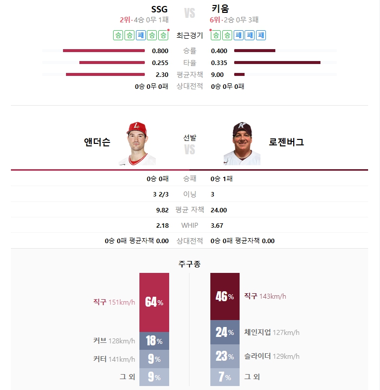 양 팀 모두 외국인 선발이 무너졌던 개막전 이후 첫 재등판. 키움은 로젠버그의 부진 탈피 여부가 변수, SSG는 앤더슨이 야간 경기 + 키움 상성에서 우위를 보여왔다는 점에서 선발이 경기 흐름을 좌우할 가능성 높음. 불펜 안정성도 SSG 쪽이 낫다.