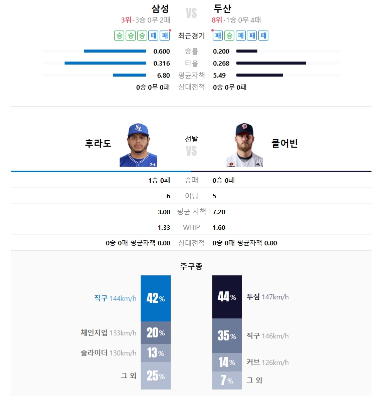 • 삼성 후라도: 6이닝 2실점. 1회 제외하고 안정적 운영. 두산 상대로 평균적인 기록