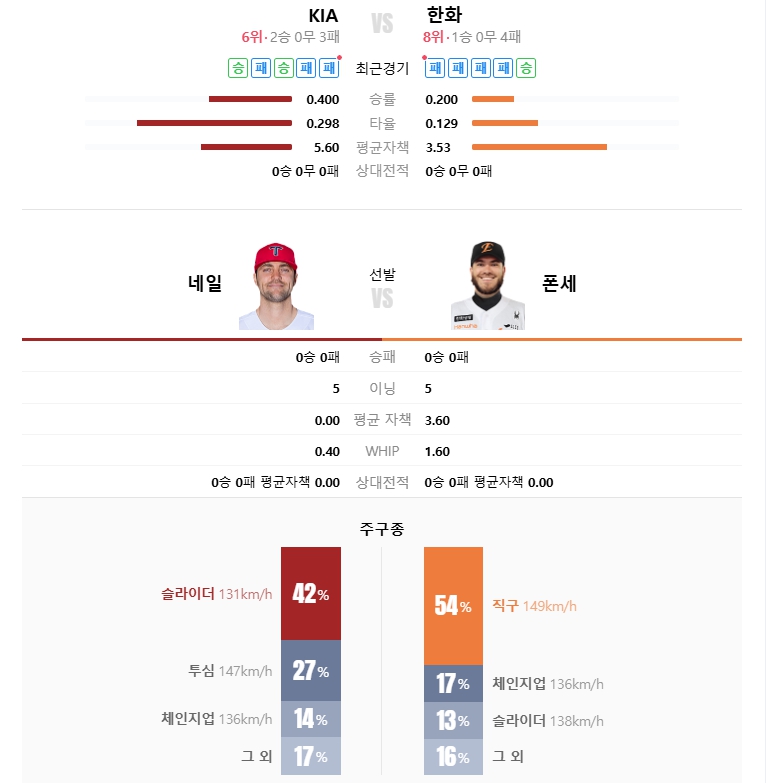 • 예상 스코어: KIA 4 : 한화 3