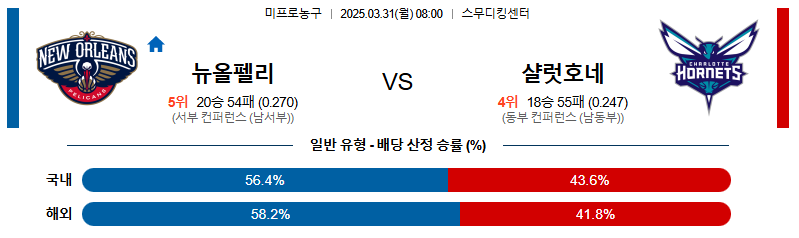 # 홈팀 : 뉴올리언스 펠리컨스(20승54패)