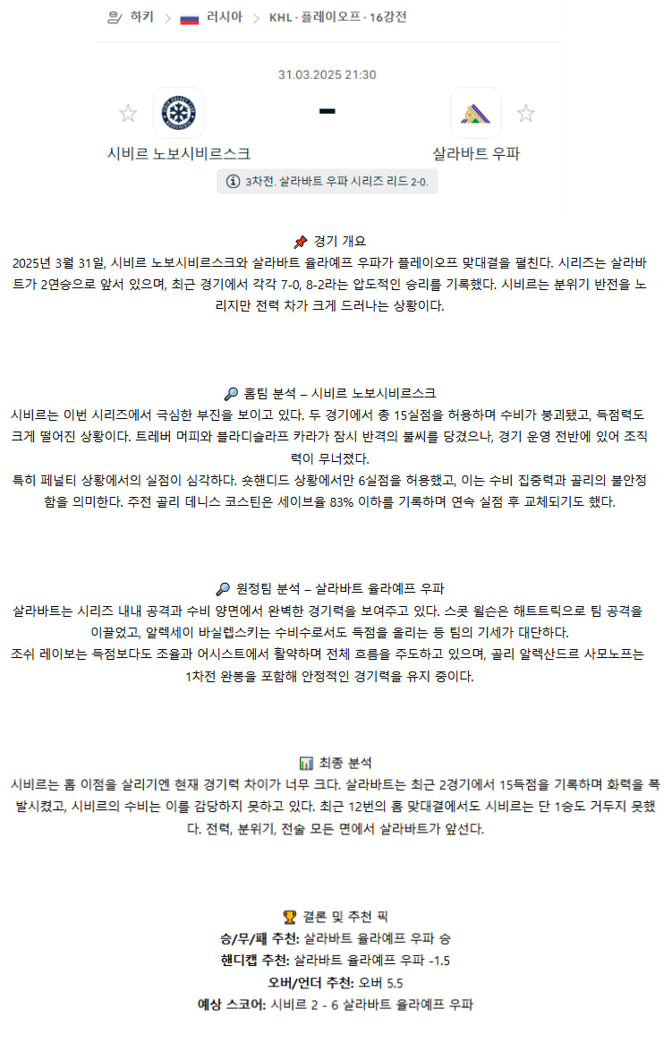 3월31일 21:30 KHL 시비르 노보시비르스크 vs 살라바트 우파 아이스하키분석 3 강백호 하키 0 85 2025.03.31 19:26 Author 3 0 Lv.3 3 강백호 최고관리자 6,300 (0%) 등록된 서명이 없습니다.