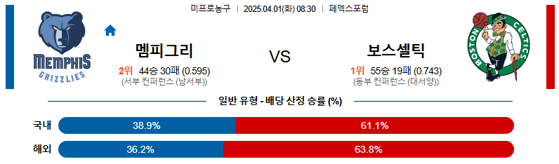 【NBA 프로농구】 04월 01일 멤피스 vs 보스턴