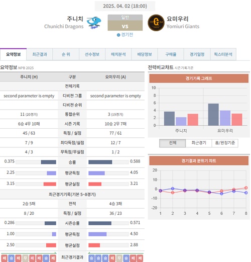4월 2일 일본야구(NPB) 주니치 VS 요미우리 [분석,추천]