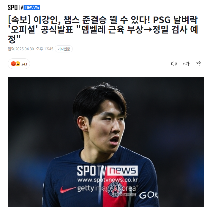 이강인에게 행운의 기회가 찾아왔습니다. 파리 생제르맹의 핵심 선수인 우스망 뎀벨레가 챔피언스리그 4강 1차전에서 근육 부상을 입었기 때문입니다. 루이스 엔리케 감독은 경기 후 공식 기자회견에서 뎀벨레의 부상이 심각할 경우 다른 선수에게 기회가 넘어갈 것이라고 밝혔습니다.