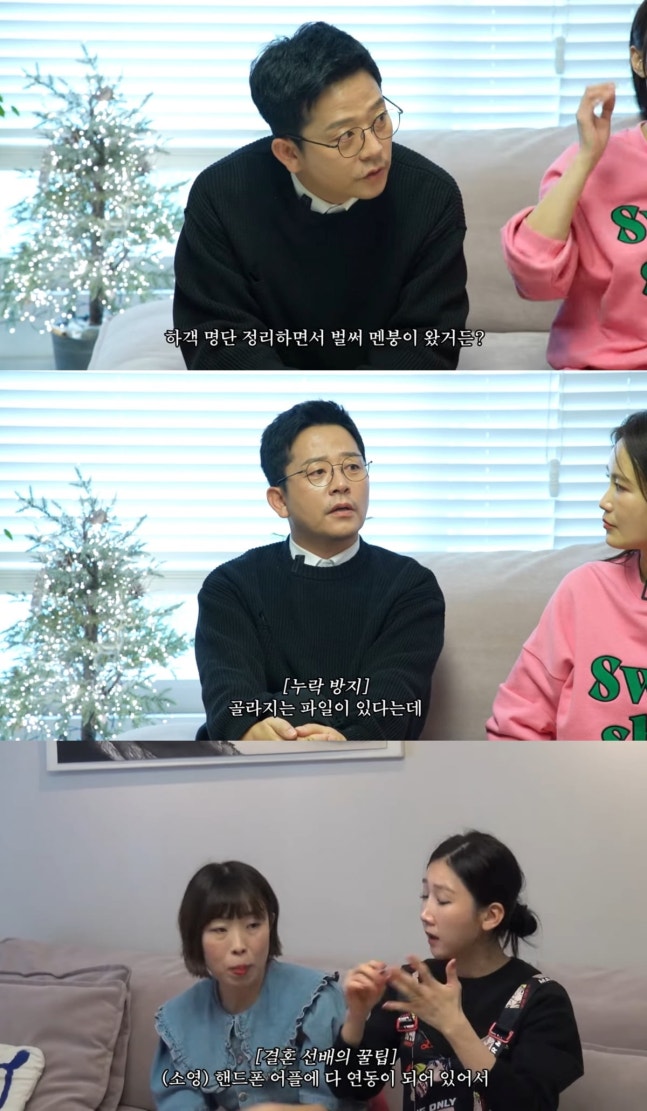 김준호는 "물어보고 싶은 게 하나 있다. 하객 명단 정리하면서 벌써 멘붕이 왔다"고 털어놨다. 이어 오나미와 박소영에게 "엑셀로 정리했냐"고 질문했다. 오나미는 "엑셀로 하긴 했는데 나중에는 메모장에 쓰기도 했다"고 말했다. 김준호는 "엑셀로 기역, 니은 순으로 해서 겹치는 사람을 골라낼 수도 있다던데"라며 결혼 선배의 조언을 구했다.