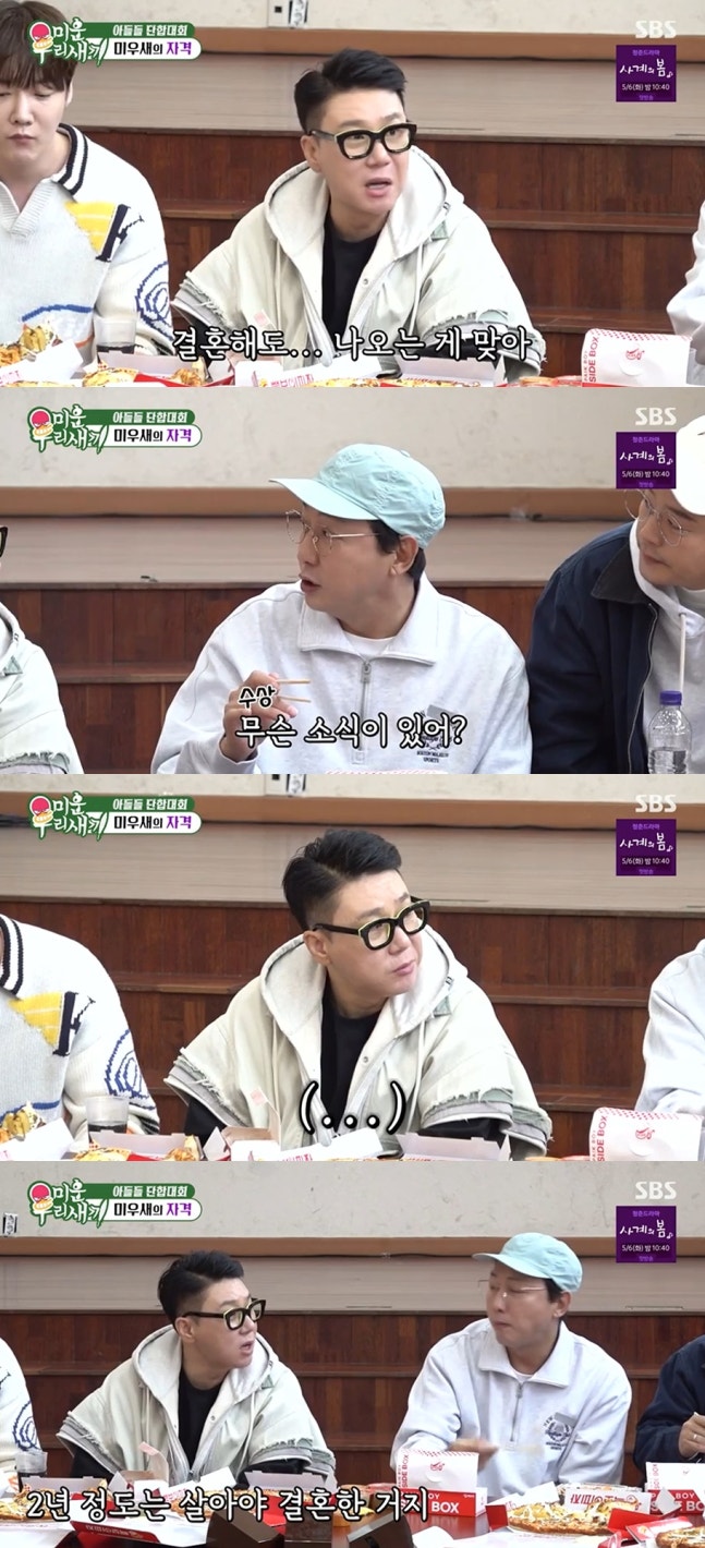 탁재훈이 "무슨 소식이 있어?"라고 수상쩍은 눈빛을 보이자 이상민은 잠시 아무런 말도 하지 못하더니 "2년 정도는 살아야 결혼한 거다"라고 주장했다.