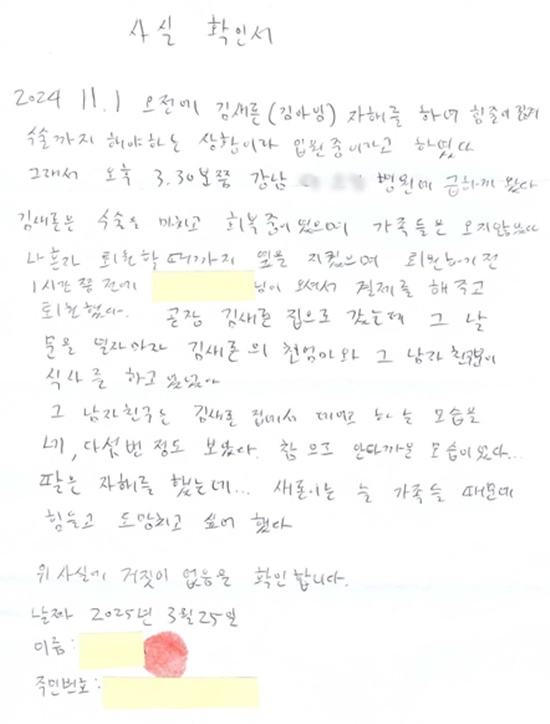 K씨는 자신의 제보와 증언의 신빙성을 담보하기 위해 직접 이름과 주민번호와 지장을 찍어 사실확인서를 작성했다. 김새론이 자해 후 서울 강남의 D병원 응급실 치료 당시 상황도 상세하게 적었다. K씨는 이 내용을 녹취 증거로 남기기 위해 녹음도 했다.