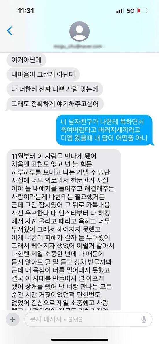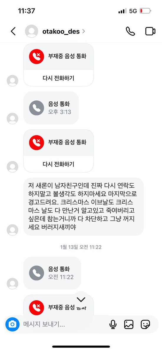 "결혼했으니까 (딴 놈한테) 더이상 연락하지 말고 X같이 살다 싼 니 똥은 니가 치우세요. X대가리XX아'(1월13일, 김새론에게 보낸 뉴욕 남자의 문자 폭언)