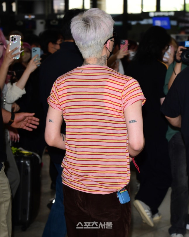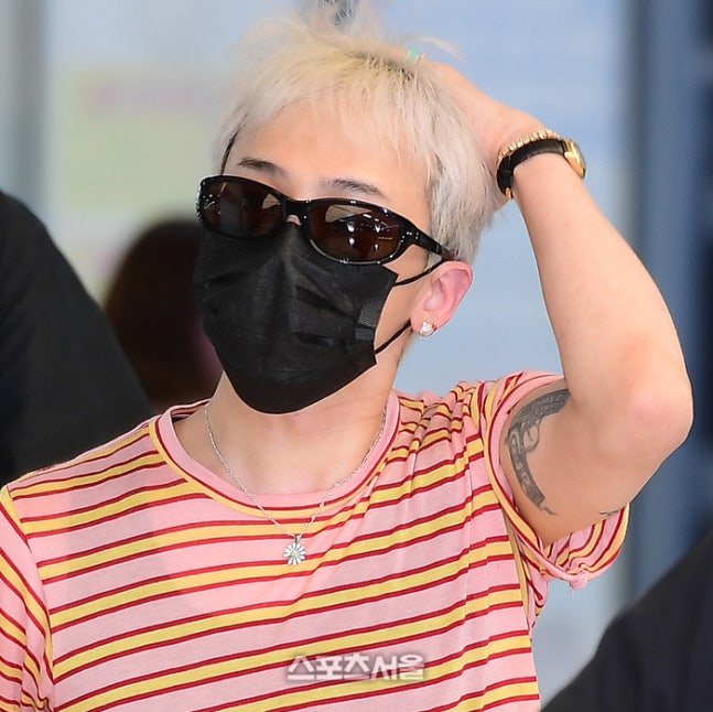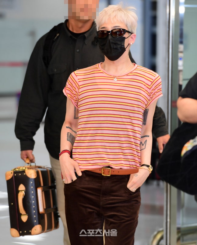 지난 27일 오후, 해외 일정을 마치고 김포국제공항에 모습을 드러낸 그는 레드·옐로우 스트라이프 티셔츠에 초콜릿 컬러 벨벳 팬츠를 매치하며 레트로 무드를 완성했다. 롤업 소매와 실버 네크리스, 드러난 타투까지 하나하나가 ‘무심한 듯 강렬한’ GD 시그니처 룩이다.