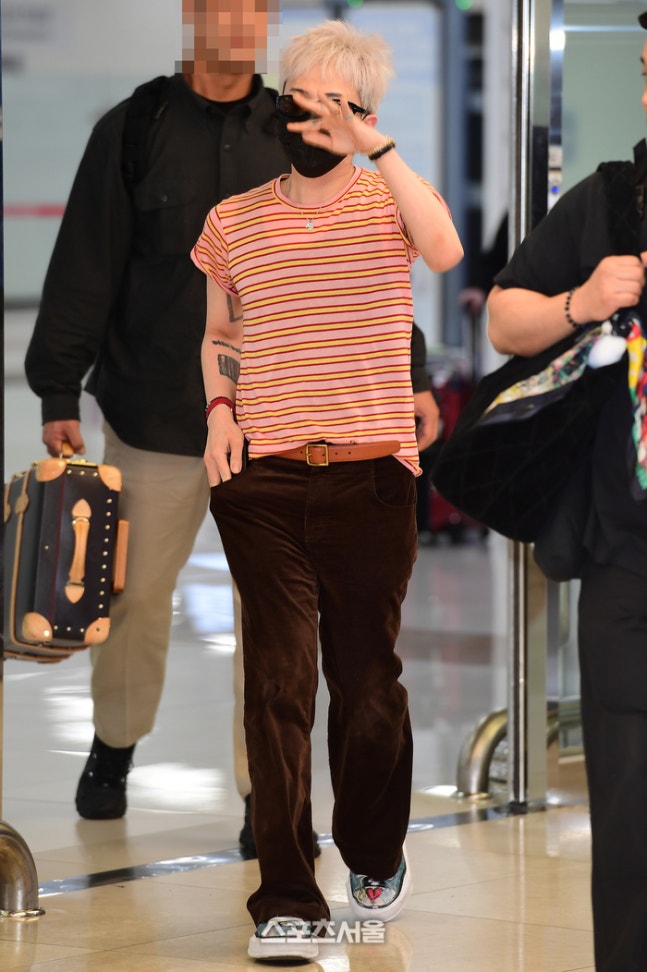 아이스 블론드 헤어와 블랙 마스크·선글라스로 균형감을 더하고, 블루 그래픽 스니커즈로 발끝에 유쾌한 반전을 더한 그의 스타일은 공항을 하나의 무대로 만들었다.