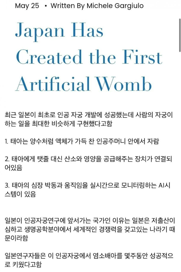 일본이 세계 최초로 인공 자궁 개발에 성공했다는 소식이 들려오고 있다.