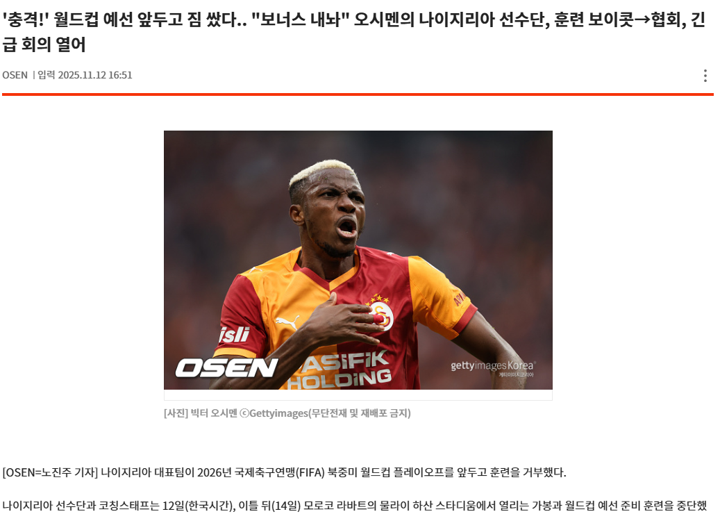 2026 FIFA 북중미 월드컵 아프리카 지역 플레이오프를 앞두고 나이지리아 축구 국가대표팀, '슈퍼 이글스(Super Eagles)'에 비상이 걸렸습니다. 팀의 핵심 공격수 빅터 오시멘(Victor Osimhen)을 포함한 선수단 전체가 나이지리아 축구 연맹(NFF)을 상대로 미지급된 수당 및 보너스 문제로 인해 훈련을 보이콧하는 충격적인 사태가 발생했습니다.