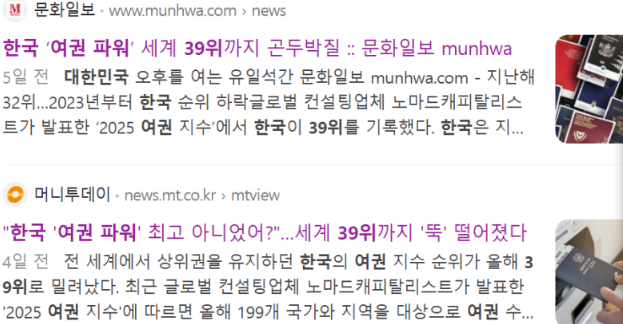 한국 여권이 39위로 떨어졌다고 하더군요. 지금 언론에서 난리가 났어요.