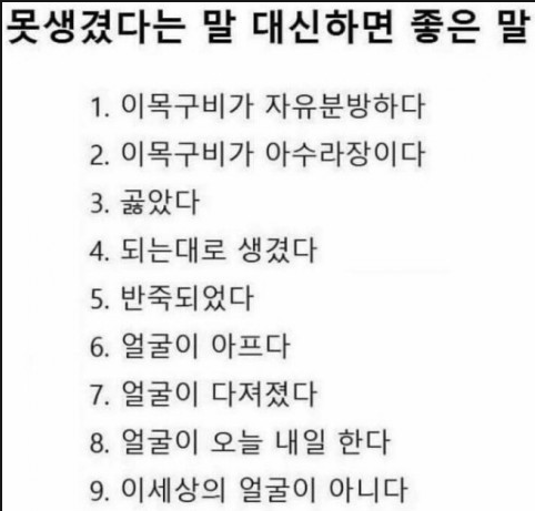 얼굴이 못생겼다를 대신 할 수 있는말 7 뚜리뚜리까뚜리 0 11 2025.10.27 20:09 ㅎ Author 1 0 Lv.7 7 뚜리뚜리까뚜리 골드 23,200 (14.5%) 등록된 서명이 없습니다.