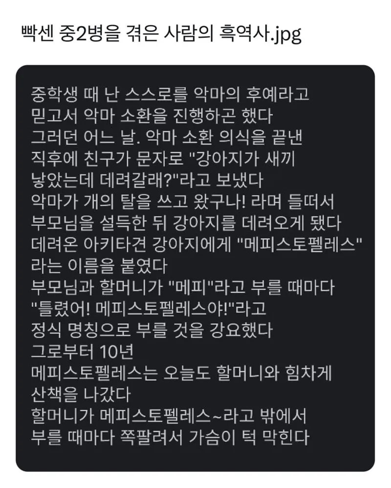 중2병 빡세게 겪은사람 흑역사 ㅋㅋ 3 LA다정스 0 13 2025.05.15 00:54 Author 0 1 Lv.3 3 LA다정스 최고관리자 8,500 (61.1%) 등록된 서명이 없습니다.