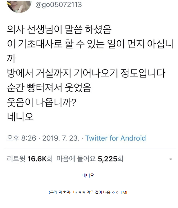 의사vs환자 7 뚜리뚜리까뚜리 0 5 2025.08.14 20:11 ㅋㅋㅋㅋㅋ Author 1 0 Lv.7 7 뚜리뚜리까뚜리 골드 23,200 (14.5%) 등록된 서명이 없습니다.