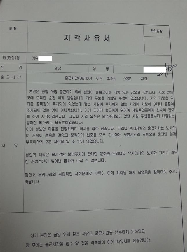 어느 직장의 지각 사유서