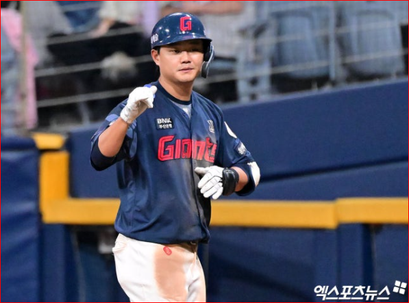 이어진 황성빈 타석에서 기습번트가 나오자 스타트를 끊었다 귀루, 최초 견제 아웃 판정을 받았다 비디오판독 끝 세이프로 판정이 번복되며 기사회생했다. 오른손을 뻗었다가 3루수 송성문의 글러브가 다가오자 오른손을 빼고 왼손으로 3루 베이스를 터치하는 기지를 발휘했다.