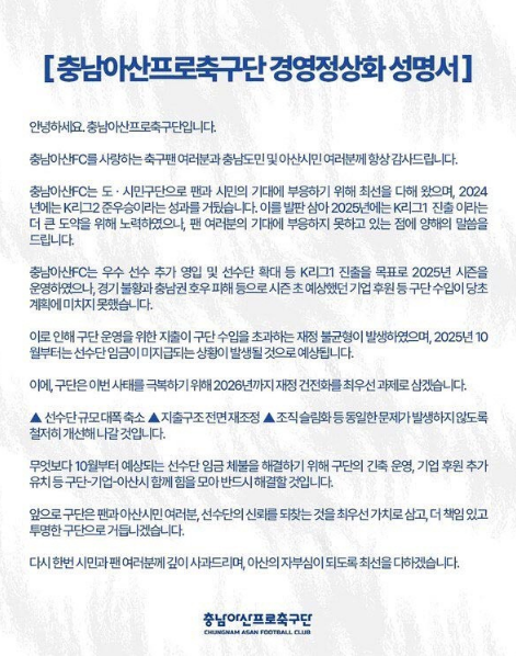 당시 충남아산FC는 "구단 운영을 위한 지출이 수입을 초과해 재정 불균형이 발생했다"라며 "선수단 임금을 지급하지 못하게 됐다"라고 설명했다.