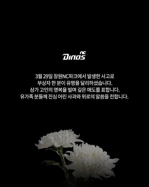 NC는 31일 구단 SNS를 통해 “3월29일 창원NC파크에서 발생한 사고로 부상자 한 분이 유명을 달리하셨습니다. 삼가 고인의 명복을 빌며 깊은 애도를 표합니다. 유가족 분들께 진심 어린 사과와 위로의 말씀을 전합니다”라고 밝혔다.