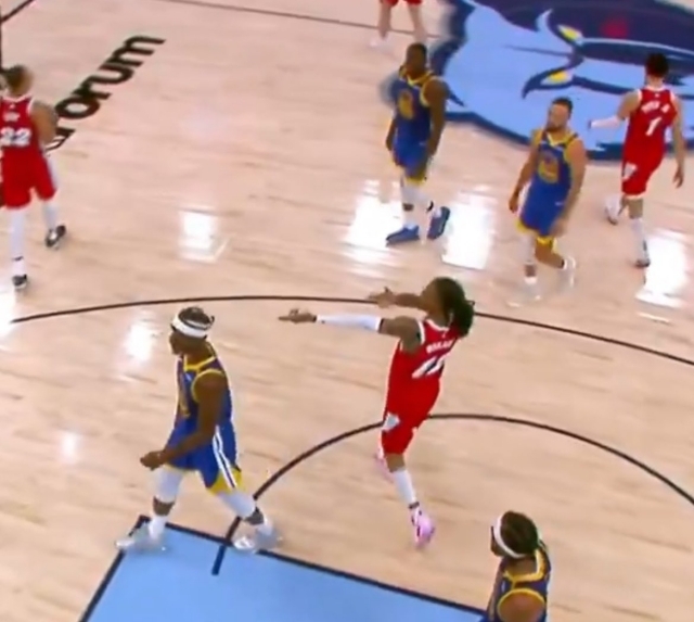 모란트는 경기 종료 20.8초를 남긴 상황에서 지미 버틀러의 자유투가 끝난 후 갑자기 골든스테이트 벤치를 향해 ‘권총 제스처’를 했다. 이에 드레이먼드 그린이 항의했고 스테판 커리는 당황한 듯한 모습을 보였다.