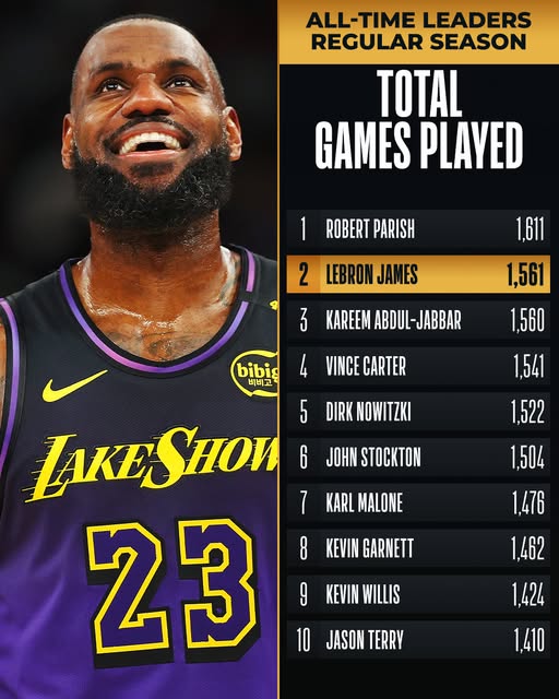 이제 그의 앞에는 단 한 명, 레이커스의 영원한 라이벌 보스턴 셀틱스의 레전드 로버트 패리시(1,611경기)만이 남아 있다. 앞으로 51경기만 더 출전하면 르브론은 정규 시즌 최다 출전 기록의 주인공이 된다.